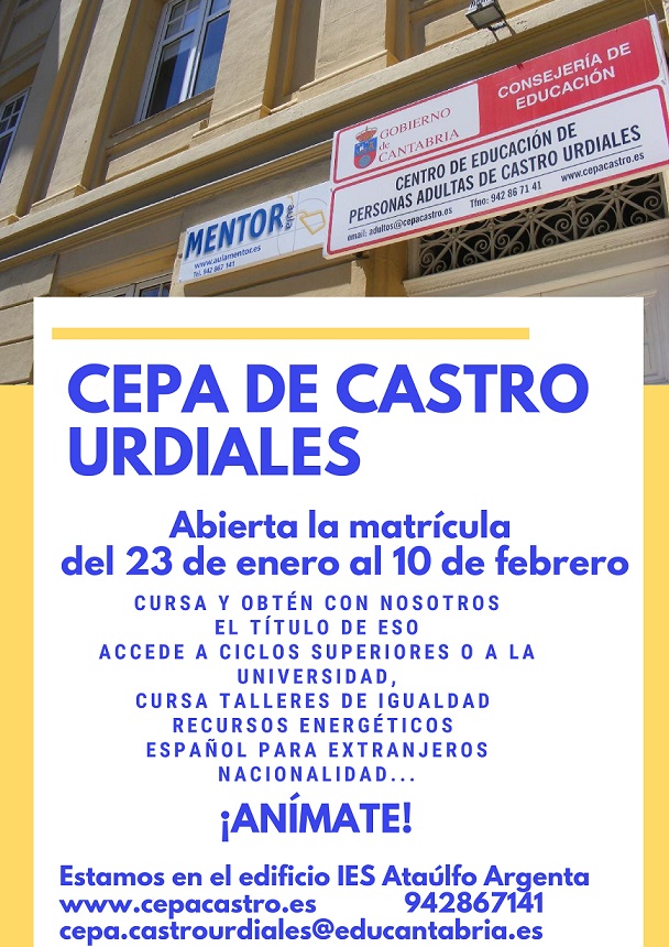 En el Centro de Educación de Personas Adultas de Castro Urdiales (CEPA) abre de nuevo la matrícula del 23 de enero al 10 de febrero, de 15:30 h a 17:00 h.