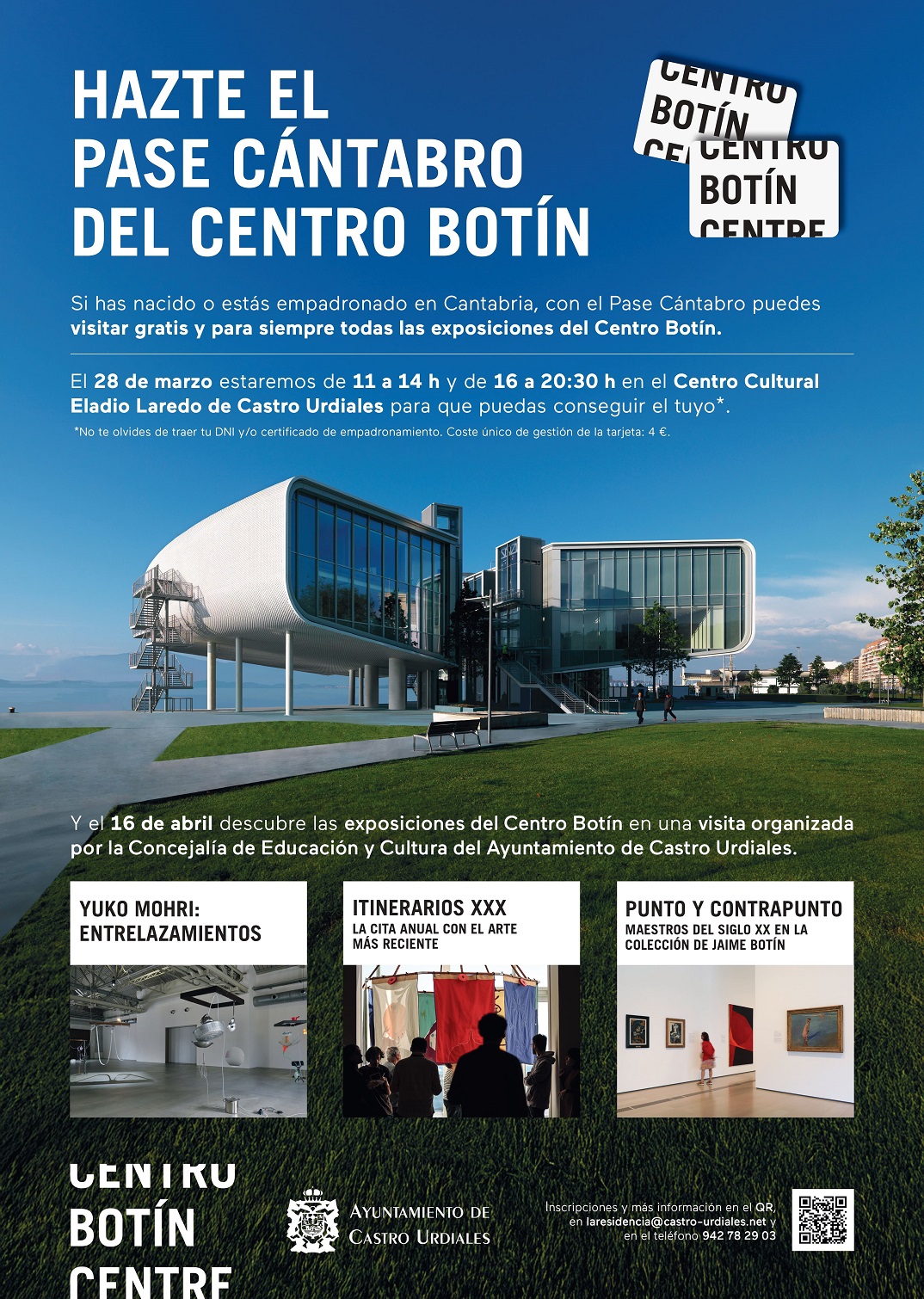 Este pase, que tiene un coste único de 4 euros, se podrá obtener en Castro el próximo sábado 28 de marzo, de 11 a 14 y de 16 a 20.30 horas, en el Centro Cultural Eladio Laredo (edificio Royal, c/ Jardines, 3). Personal del Centro Botín estará en ese horario disponible para emitir el Pase Cántabro a las personas interesadas, para lo cual estas deberán acudir con su DNI y/o certificado de empadronamiento.