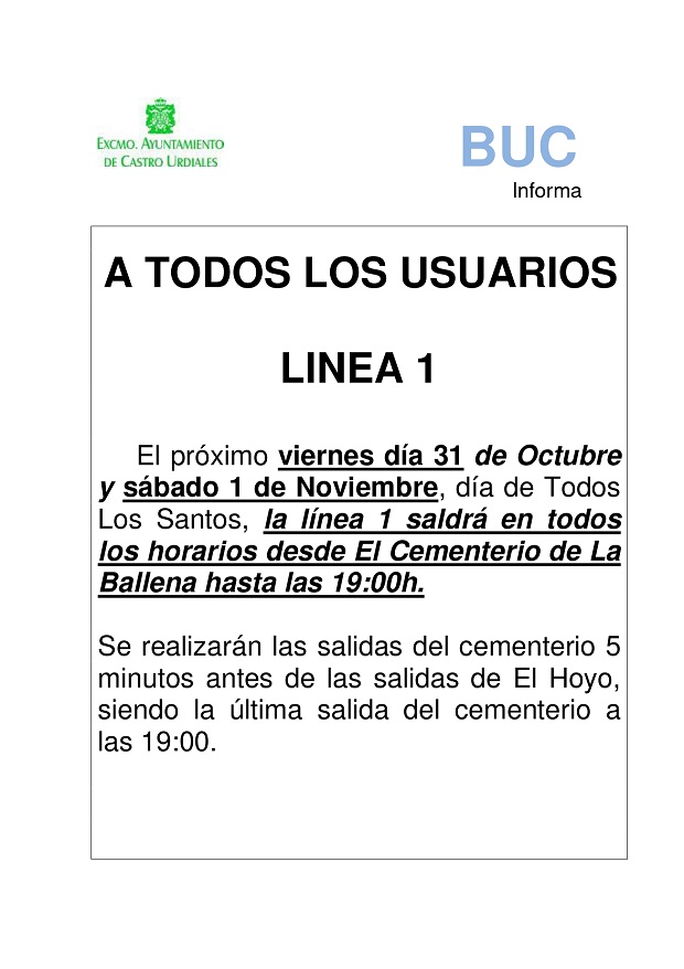 EL AYUNTAMIENTO DE CASTRO-URDIALES PONE EN MARCHA EL SERVICIO DE CASTROBUS AL CEMENTERIO DURANTE LA JORNADA DE MAÑANA VIERNES 31 DE OCTUBRE Y EL SÁBADO 1 DE NOVIEMBRE, DÍA DE LA CELEBRACIÓN DE TODOS LOS SANTOS