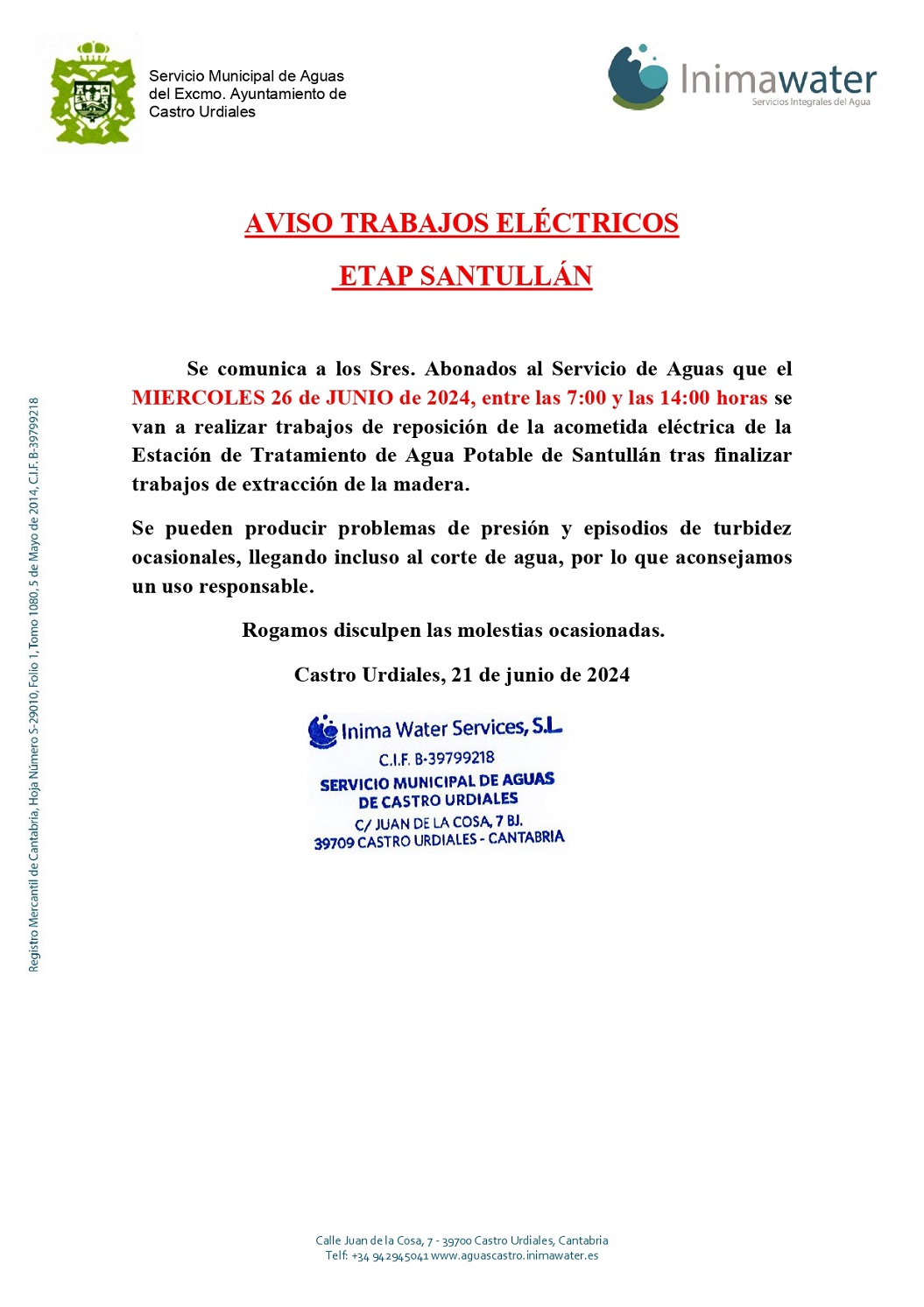 Reposición de acometida en la Estación de tratamiento de Agua Potable en Santullán. Problemas de presión, episodios de turbidez ocasionales y cortes